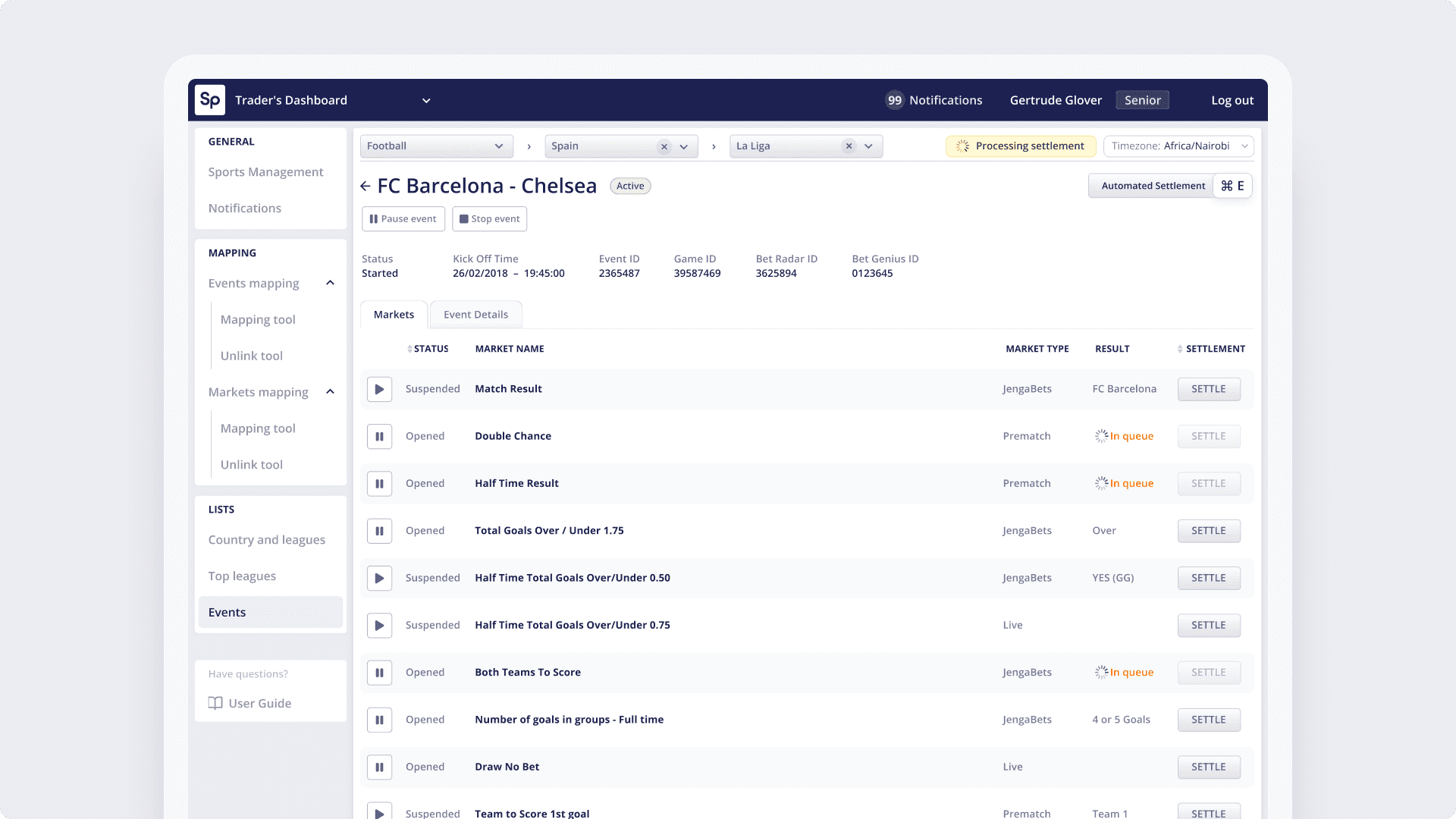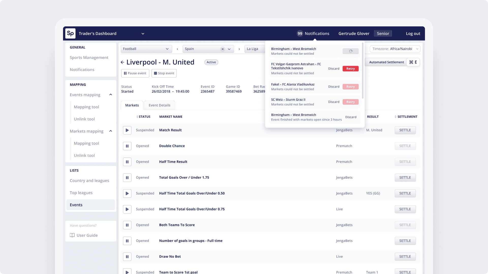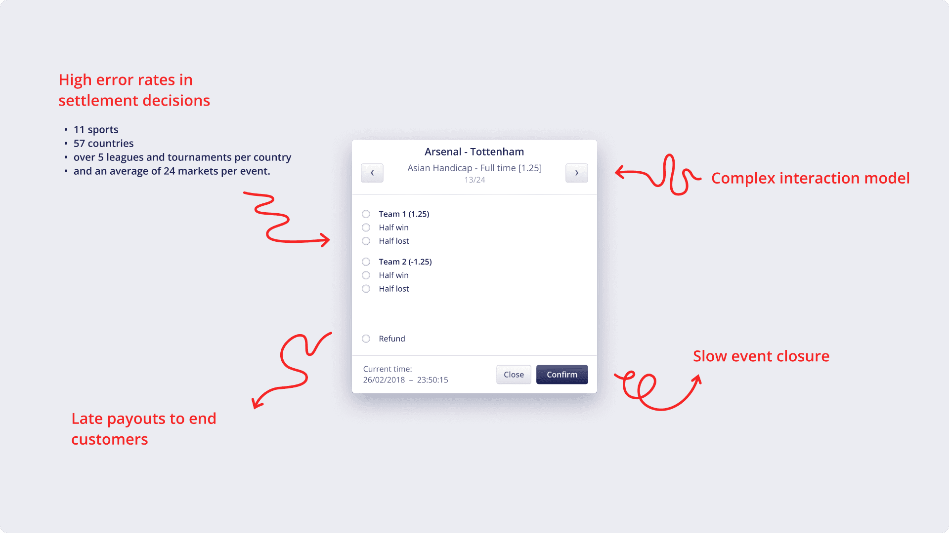 Traders were responsible for reviewing multiple markets per event, cross-checking half-time and full-time results, and resolving inconsistencies by hand. When errors occurred, recovery often happened after settlement, increasing operational risk and pressure.